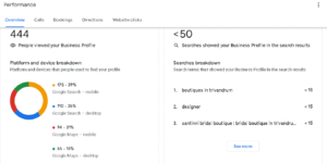 As part of my Designers Den academic project, I set up and monitored a Google Business Profile to increase local search visibility. Over the six-month period, the profile received 444 views and 251 interactions, primarily from mobile search and maps. Top search terms included “boutiques in Trivandrum” and “bridal boutique in Trivandrum.” I analyzed platform usage across mobile and desktop, tracked performance month-over-month, and used these insights to better understand local SEO and user behavior in Google services.